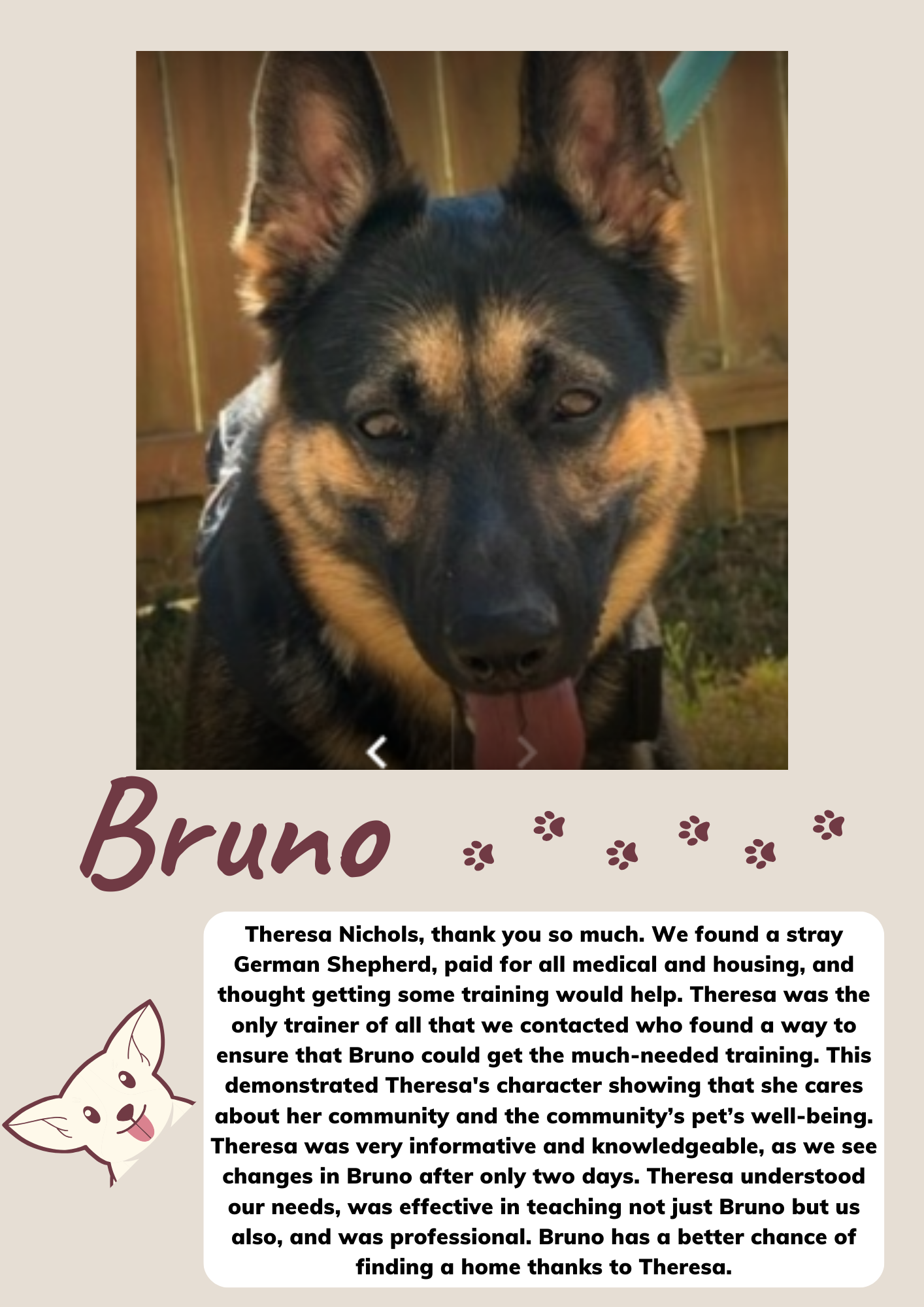 We had a great experience. Theresa gave us a great training regiment that was catered to the issues we were dealing with. We saw a huge change of behavior in our pup after only 2 weeks of following the training!