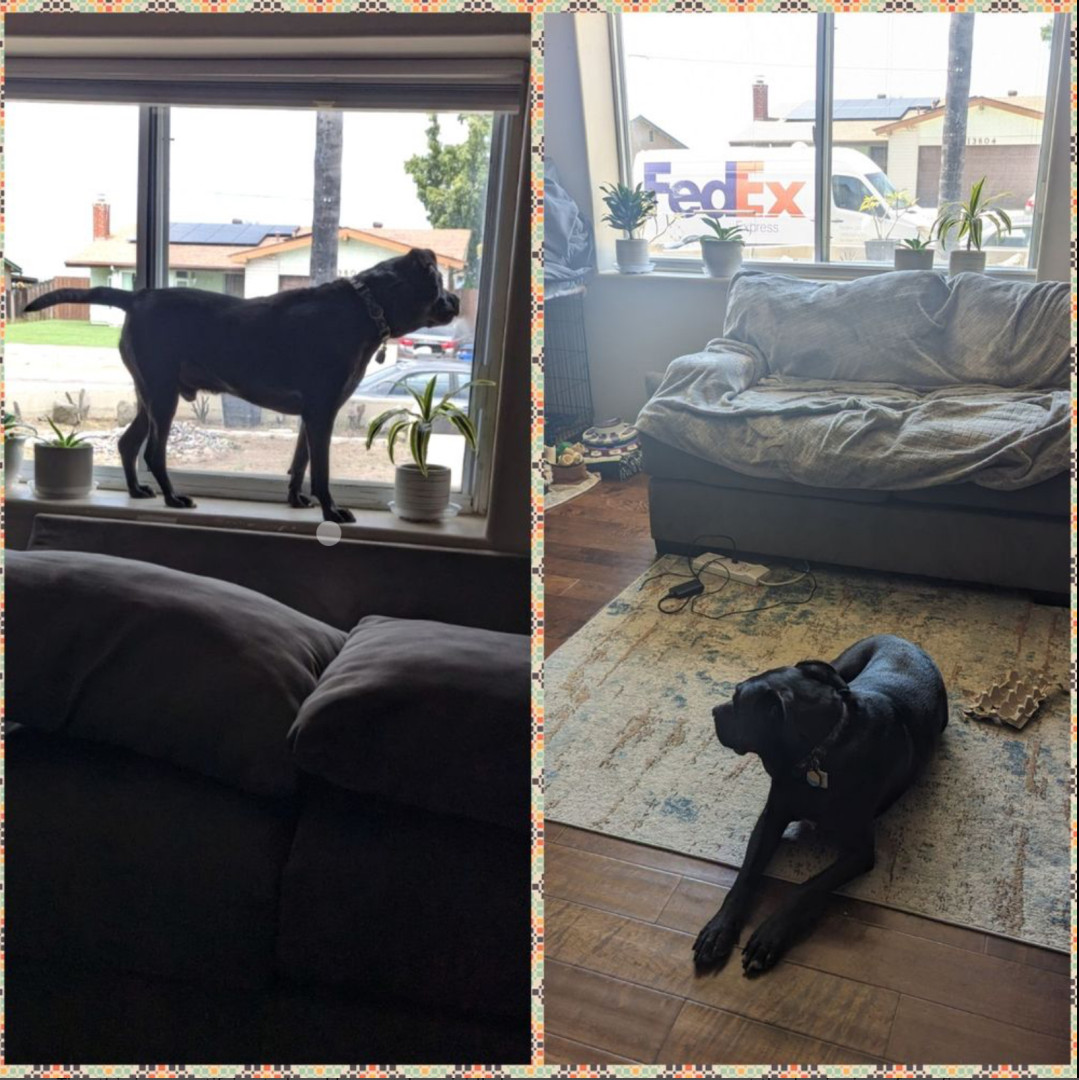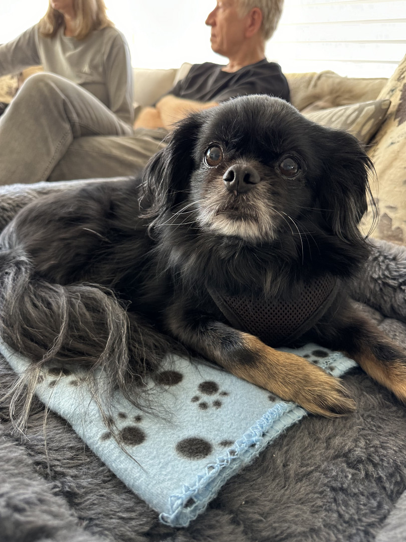 At first, Mimi had severe separation anxiety. She would escape her playpen, pace, and howl loudly whenever we left the house. Now, with Jenna’s guidance and the time we’ve put into her training, we can leave her alone for up to three hours. She’ll fall asleep and wait for us quietly. You can see her in one of the photos we attached.